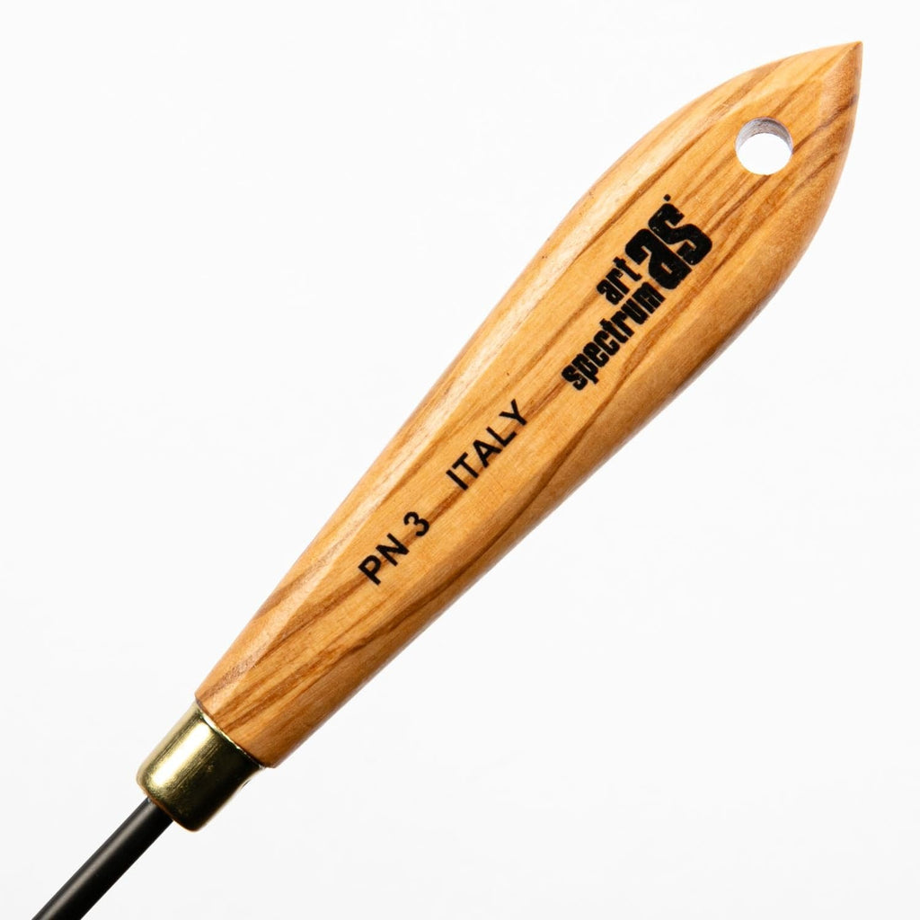 Art Spectrum® Painting and Palette Knives are a professional quality European made range with hand ground hardened steel blades in a black burnished finish. The handle is made of Olive wood and has a polished brass ferrule.