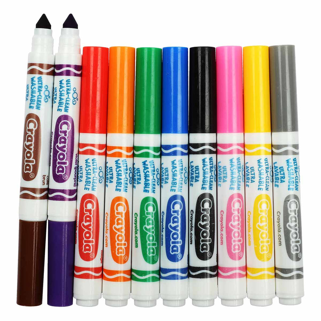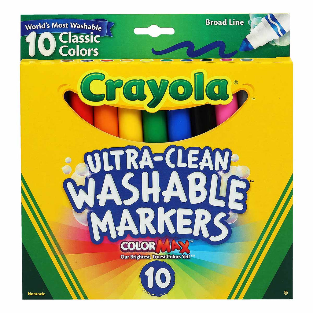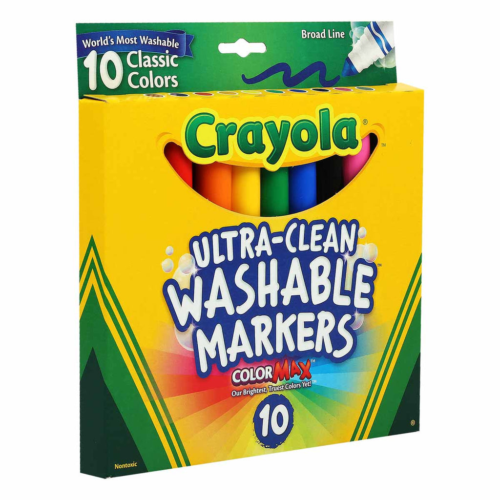 Ultra-Clean Washable Broad Line Markers Bold Colors are specially formulated with ColorMax technology to have the brightest, vivid colors and overall great quality you expect from Crayola products. The Markers feature a versatile tip that draws both thick or thin lines. When compared with other Markers ours are longer-lasting and wont dry out as the tip can be rejuvenated by dipping in room temperature water. Crayola's Ultra-Clean Washable Ink is specially formulated to wash off machine washable clothing. It also washes off walls, carpet and furniture with warm water and a sponge because not everything your child makes is a keeper! Includes 10 Bold colors.