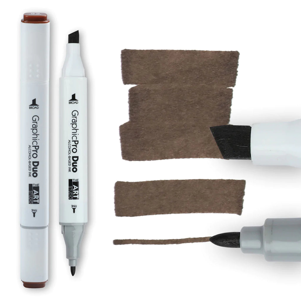 The Art Studio's Graphic ProDuo Markers are alcohol-based felt tip pens that are the ideal choice for artists wanting a high-quality, versatile marker. As the name implies, each pen has a different shaped nib at each end - one end is a fine tip and great for small details, while the other is broad and perfect for filling in large blocks of colour. They can be used on all sorts of surfaces like paper, plastic, cloth and metal, as the alcohol in them dries very quickly and stays permanent. You can even blend colours together! The Chocolate marker produces a cool, dark brown colour when used and is a handy colour for any artist to have in their arsenal.